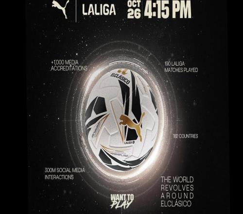 雷速体育10月9日报道宣称 北京时间10月26日23:15,西甲第10轮,皇马在主场迎来与巴萨的本赛季首次西班牙国家德比。这场比赛的专属比赛用球已经揭晓。彪马和西甲联赛联合发布了
